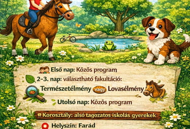We offer a safe, small-group countryside adventure where children disconnect from screens and reconnect with nature. Our camp offers children an unforgettable week full of outdoor adventures, hands-on experiences, and fun in nature. The camp takes place in a safe, fenced family yard, close to animals, forest, and meadows, with a private playground. The camp is run by a local family experienced in working with children and animals.
